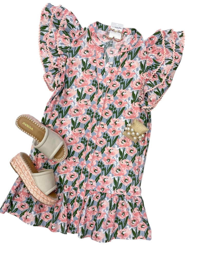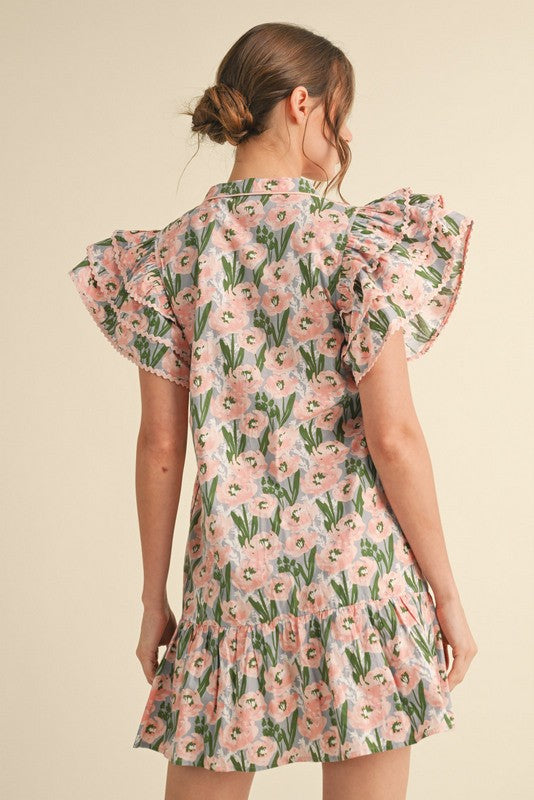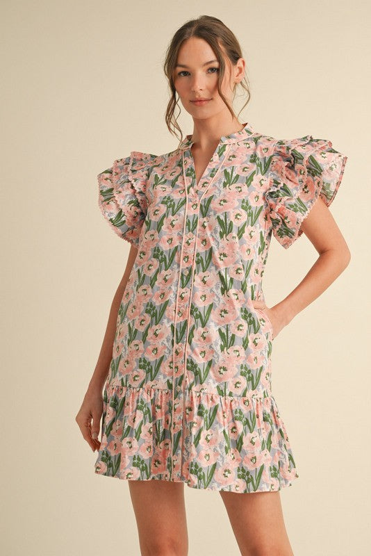 Layer ruffle trimming shoulder features solid trim at the sleeve ends