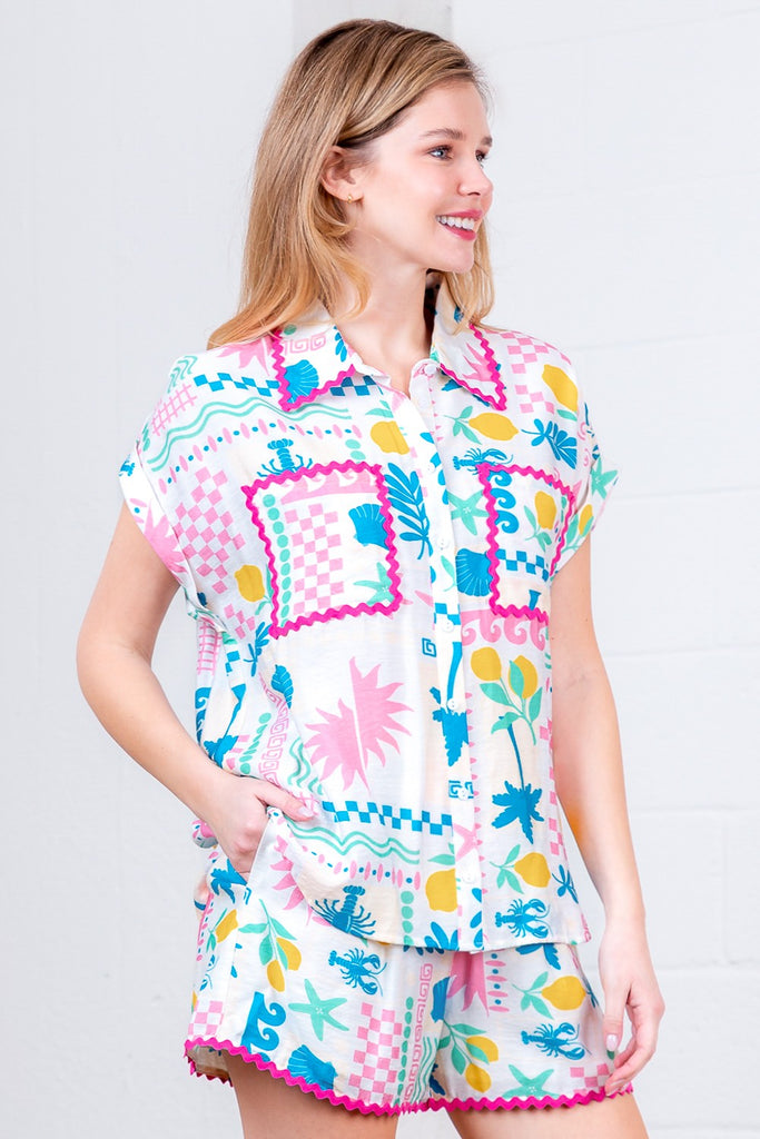 Top: Collared, 2 front pockets relaxed fit 80% Cotton, 20% Nylon