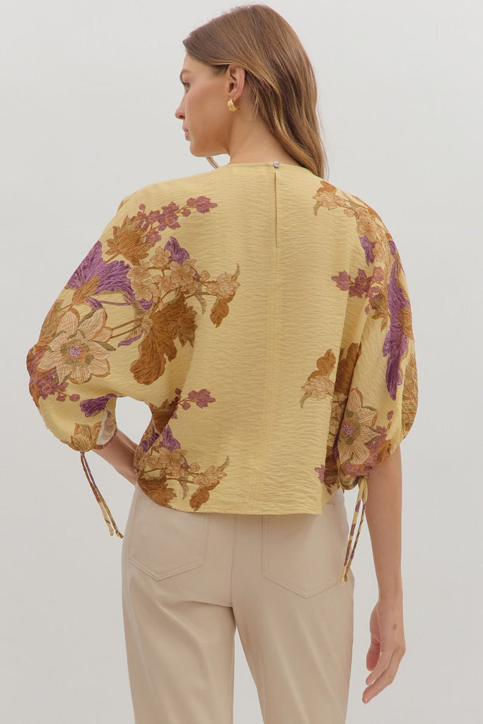 Featuring textured fabric and gathered sleeve hem with tie detail