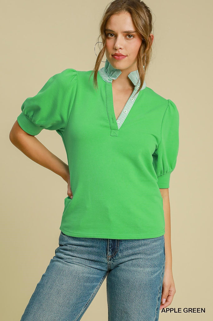 Stripe Print Contrast Ruffled High Neckline with Split V Button Trim Detail Puffed Short Sleeve with Cuff Solid TopFabric Contents83% Cotton 17% Polyester